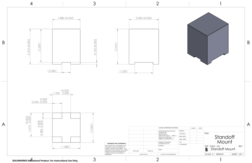 Manufacturing Processes project as a member of the manual machining subgroup. The project required collaboration between several groups of engineers, each working on an independent component to meet overarching assembly requirements. The manual machining subgroup was tasked with designing and manufacturing a standoff mount that interfaces with a 3D printed component and satisfies the final height requirement of a PCB, which gets secured on the top of this component. Design prioritized ease of manufacturing, utilizing multiple passes with a single 1/2″ end mill to create five final parts, each within the required tolerances. These parts were then passed on to a CNC machining subgroup, which completed the final cuts on each component.